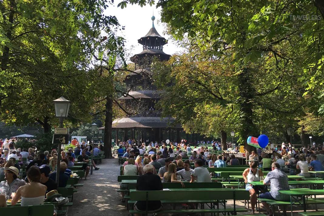 The huge beer garden at the Chinese Tower in Munich. Beer gardens are a tradition in Bavaria